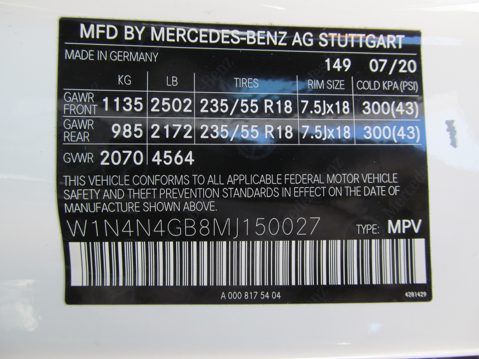 VIN:W1N4N4GB8MJ150027